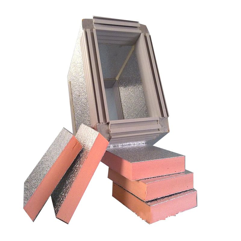 酚醛復合風管中間層為酚醛泡沫,內外層為壓花鋁箔復合而成。酚醛泡沫板與鋁箔復合制成夾芯板,然后加上專用法蘭配件,制成的酚醛復合風管用于中央空調通風。酚醛復合夾芯板其內外表面是涂層鋁箔,中間層為酚醛泡沫材料,其綜合性能有較大的改觀,特別是在力學性能方面,如抗彎曲性、抗壓、脆性及加工性能等方面都有較大的改進,基本上滿足了空調通風管的使用要求。